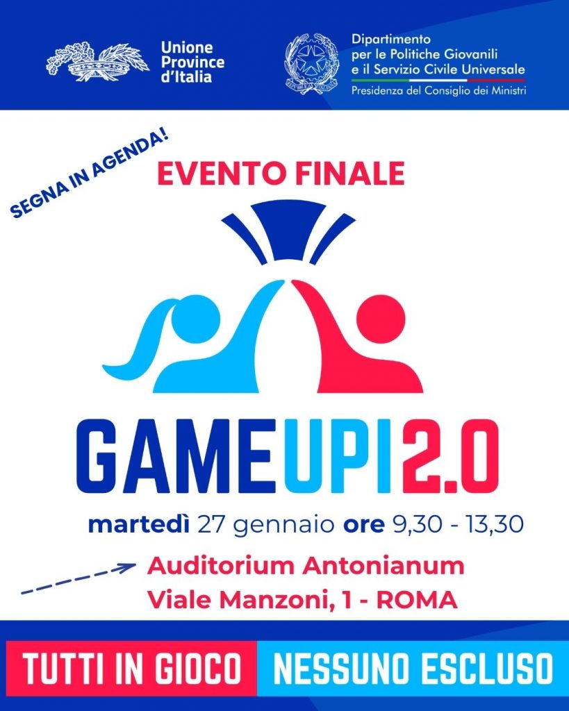Si chiuderà domani, con un evento finale a Roma, il programma Game UPI2.0, promosso da UPI e finanziato dal Dipartimento per le politiche giovanili e il servizio civile universale, che ha visto la partecipazione di decine di migliaia di ragazze e ragazzi in centinaia di incontri, momenti di studio, riflessione e dibattito, occasioni di crescita personale e sociale, in tutta Italia.