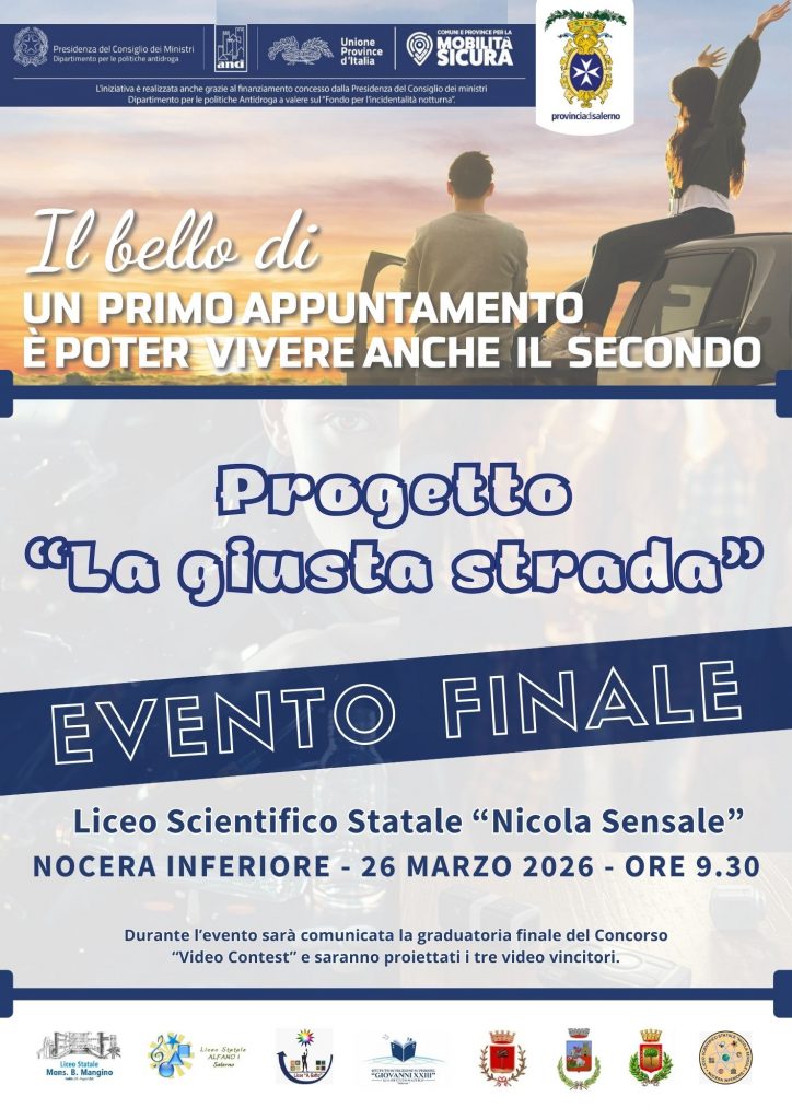 Si terrà il prossimo giovedì 26 marzo, alle ore 9,30, l’evento finale del progetto “La giusta strada” realizzato dalla Provincia di Salerno nell’ambito dell’iniziativa Mobilità Sicura promossa da UPI grazie al finanziamento del Dipartimento delle Politiche contro la droga e le altre dipendenze della Presidenza del Consiglio dei Ministri.