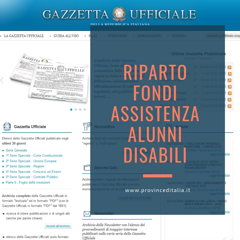 E’ stato pubblicato sulla Gazzetta Ufficiale del 28 gennaio 2019 (Serie Generale n.23) il Decreto del Presidente del Consiglio dei Ministri del 21 dicembre 2018 con il “Riparto del contributo di 75 milioni di euro, per l’anno 2018, a favore delle Regioni a Statuto Ordinario e degli Enti territoriali che esercitano le funzioni relative all’assistenza per l’autonomia e la comunicazione personale degli alunni con disabilita’ fisiche o sensoriali”