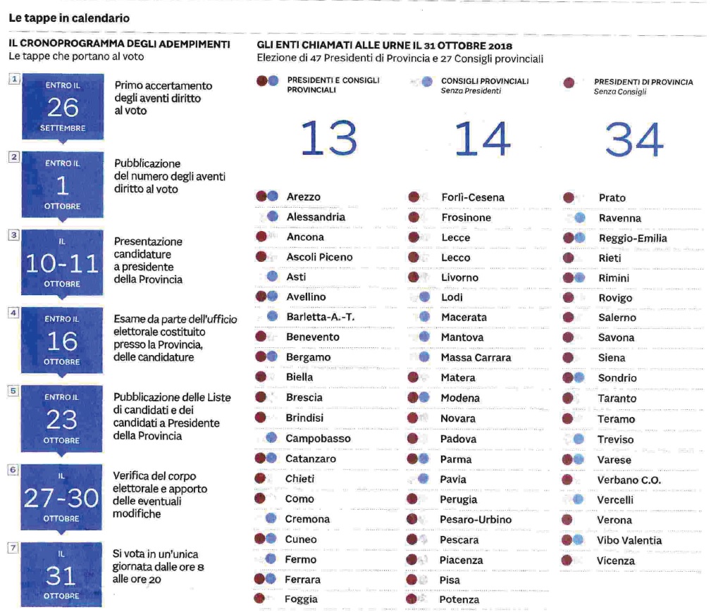 Verso il 31 ottobre: elezioni per il rinnovo di 47 Presidenti di Provincia e 27 Consigli Provinciali. La tempistica del voto su Il Sole 24 Ore del 24 settembre 2018